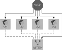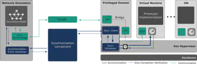 - The central synchronization component aligns the execution of all VMs and the network simulation. The synchronization is based on the provision of logical discrete time slices to all synchronized VMs and simulations. After one time slice, typically in the magnitude of a couple hundreds of microseconds, the components block their execution. The overall execution resumes when all clients have finished the time slice and after a new time slice has been assigned