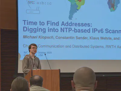 Michael’s talk at this year’s Internet Measurement Conference (IMC'25), highlighted how leveraging the NTP Pool for IPv6 address-sourcing leads to different results of active Internet scans. Specifically, as described in our paper, we found numerous services running on consumer products that are underrepresented in state-of-the-art IPv6 hitlists and also show that the deployments found via NTP-sourced addresses are often less secure. Additionally, we identified first (covert) actors adopting NTP-based address sourcing in their scanning. Michael accomplished the foundational research for this paper in his Bachelor’s thesis “Time to Find Addresses: Evaluating use of NTP Pool Data for Internet Measurements” which Markus advised.